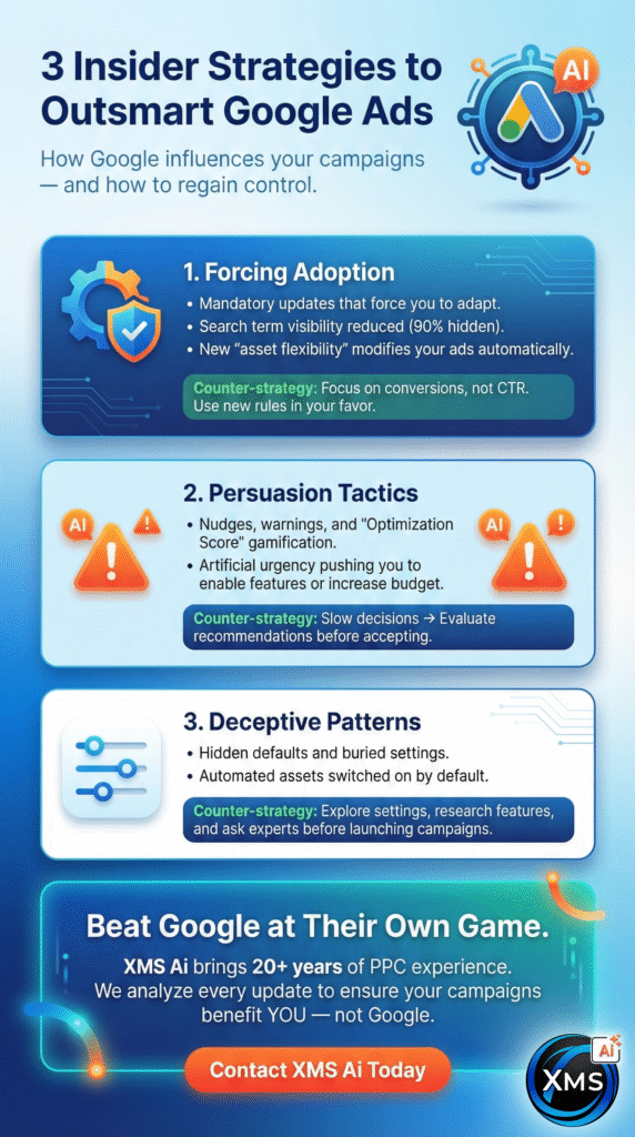 Google feeds on your budget, and it’s constantly changing to increase its revenue, whether by forcing you to adapt to the new rules, persuading you to accept them, or using deceptive patterns that hide your real choices. Awareness of these practices will help you create more effective Google Ads optimization strategies that drive revenue to your business and not to Google.